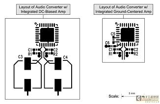 (1)最大限度地減少了PCB空間。圖3給出了需要隔直電容的音頻編解碼器與集成了地居中放大器的音頻編解碼器的PCB布局圖。