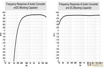 用來隔離DC電流的最常見技術是采用去耦電容,如圖1所示。在信號路徑中放置一個電容可以創建一個高通濾波器,其角頻率由耳機阻抗(R)和去耦電容(C)設置,等於1/(2πRC)。通常人的耳朵能夠聽到聲音頻率最低為20Hz。根據這個下限和耳機的典型阻抗,可很容易地計算出所需的電容值。對於20Hz的角頻率,電容容值取500uF。