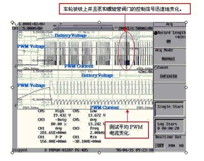 接著再次迅速提高盤式液壓,通過ABS傳(chuan)動(dong)裝(zhuang)置(zhi)增(zeng)加(jia)製(zhi)動(dong)力(li)。換(huan)句(ju)話(hua)說(shuo),可(ke)通(tong)過(guo)增(zeng)減(jian)盤(pan)式(shi)液(ye)壓(ya)防(fang)止(zhi)製(zhi)動(dong)器(qi)被(bei)鎖(suo)上(shang)。增(zeng)加(jia)盤(pan)式(shi)液(ye)壓(ya)也(ye)就(jiu)是(shi)用(yong)泵(beng)將(jiang)液(ye)體(ti)壓(ya)入(ru)汽(qi)缸(gang),會(hui)使(shi)泵(beng)馬(ma)達(da)迅(xun)速(su)工(gong)作(zuo)。這(zhe)個(ge)快(kuai)速(su)的(de)馬(ma)達(da)將(jiang)影(ying)響(xiang)控(kong)製(zhi)螺(luo)旋(xuan)管(guan)閥(fa)門(men)的(de)PWM電流信號。一般ABS操作無法得到這是否影響電池電壓波動。因此,有必要觀察這個電池電壓波動。