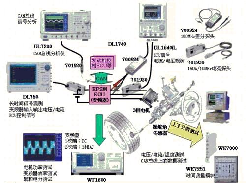 動力方向盤(EPS)在小型汽車中應用已經比較普及了,但在需大扭矩的大型車中應用時需要采用3相電機.不同於傳統的DC機,測試3相交流電機需要功率計測試電力及效率.此外,ECU間采用CAN總線通信,還必須測試CAN總線信號。