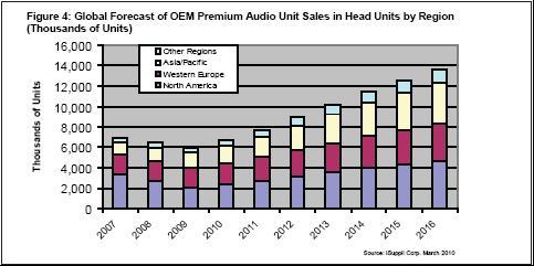 據iSuppli公司,在2009年下滑之後,全球車用高端音響係統的出貨量在2010年將以兩位數速度增長,從而為該市場在2016年翻倍鋪平道路。
