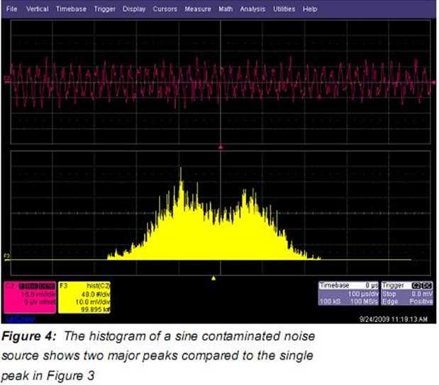 Figure 4 的直方圖稍有不同。分布的寬度增加了並且有2個峰。這是由於原本的隨機噪聲中存在小的正弦分量而引起的。正弦波分布有2個峰並且2個ge混hun合he波bo形xing圍wei繞rao著zhe構gou成cheng波bo形xing的de分fen布bu。通tong過guo觀guan察cha分fen布bu的de形xing狀zhuang可ke以yi了le解jie被bei測ce過guo程cheng發fa生sheng了le什shen麼me。在zai開kai始shi任ren何he測ce量liang之zhi前qian觀guan察cha噪zao聲sheng分fen布bu無wu疑yi是shi一yi個ge好hao的de實shi踐jian。