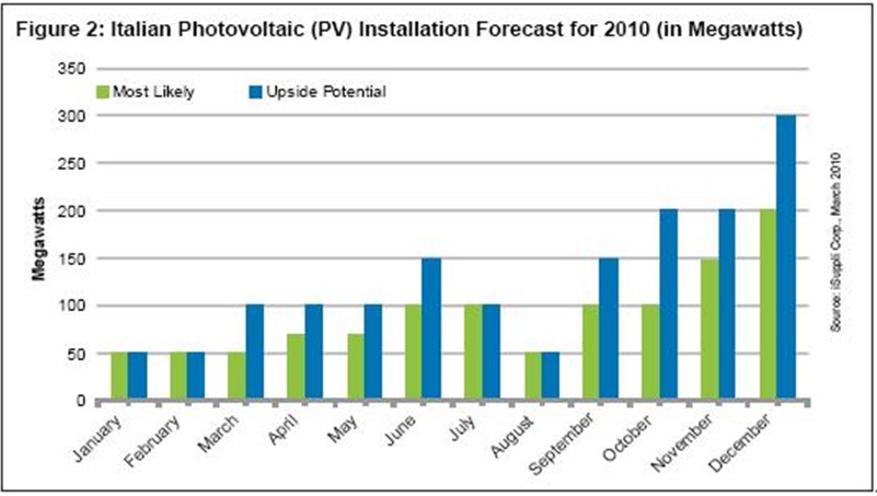 最可能出現的情況是,2010年意大利市場將安裝1.1GW,年終的四個月需求將會大增。但是,由於將下調FIT,意大利2010年安裝容量也很有可能高達1.5GW。