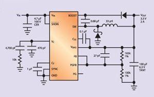 在猝發模式下,它的靜態電流低於100礎,適合輸入電壓為12V至3.3V的產品。這個器件采用厚度很薄的TSSOP封feng裝zhuang,熱re阻zu非fei常chang小xiao,適shi合he尺chi寸cun很hen小xiao的de設she計ji。最zui後hou,它ta使shi用yong了le電dian流liu模mo式shi電dian路lu,具ju有you良liang好hao的de瞬shun態tai響xiang應ying,容rong易yi補bu償chang,並bing且qie使shi用yong一yi種zhong擁yong有you專zhuan利li權quan的de電dian路lu,在zai占zhan空kong比bi為wei任ren何he數shu值zhi時shi保bao持chi開kai關guan中zhong的de峰feng值zhi電dian流liu恒heng定ding。它ta的de開kai關guan頻pin率lv是shi固gu定ding的de200kHz,此外,這個產品可以同更高的頻率同步。在整個汽車的溫度範圍內,它的穩壓性能很好,並且提供電源正常信號/複位、軟啟動和UVLO功能。這個電路是一個可靠的、高效率的降壓轉換器解決辦法,電流高達2.5A,尺寸很小,適合汽車使用。