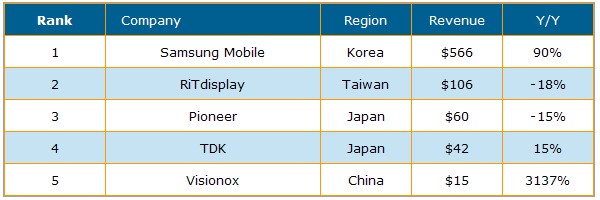從供貨商排名來看,Samsung Mobile Display遙遙領先其它廠商以5億6千6百萬美元居冠,年成長率高達90%;台灣錸寶科技(RiTdisplay)以1億零6百萬美元排名第二,較去年下滑18%;Pioneer位居第三,出貨金額為6千萬美元較去年下滑15%;TDK出貨金額較2008年提高15%,維持第四名地位;中國大陸廠商維信諾(Visionox)出貨金額較去年成長達1千5百萬美元,排名第五。