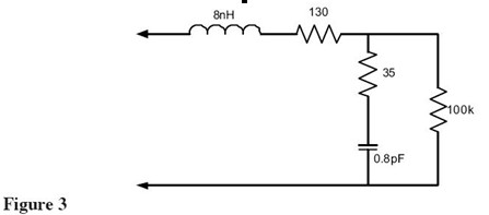 查看Figure 1中的等效電路,可以看到諧振頻率(1/(2*PI*sqrt(LC))給出)點的探頭輸入阻抗是0歐姆——完全消除了被測信號!最近一些製造商開始注意這個問題並設計具有更好輸入特性的探頭。Figure 3展示了這種探頭(Probe A)的等效電路。這是許多給出這個探頭精確依賴於尖端和地夾的等效負載模型之一。這個探頭還有一個諧振點大概是2GHz,該頻點的阻抗被電阻限製到大約165歐姆。