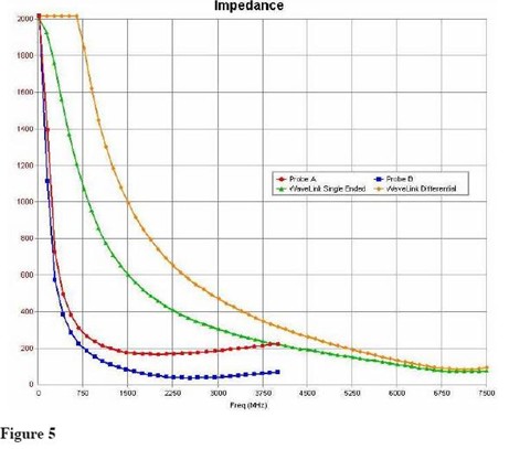 新設計的探頭輸入阻抗效應如何?Figure 5展示了Probe A阻抗 Vs 頻率在有另外一個製造商沒有仔細考慮減少輸入諧振負載的Probe B之上。同時,新的WaveLink探頭的負載效應也展示出來。由於是差分探頭,有兩條跡線——第一條顯示了當做是單端探頭(負輸入當成是地連接)是時的阻抗,第二條顯示了用平衡源驅動時的負載。跡線在每個探頭的最大規定頻率截止。