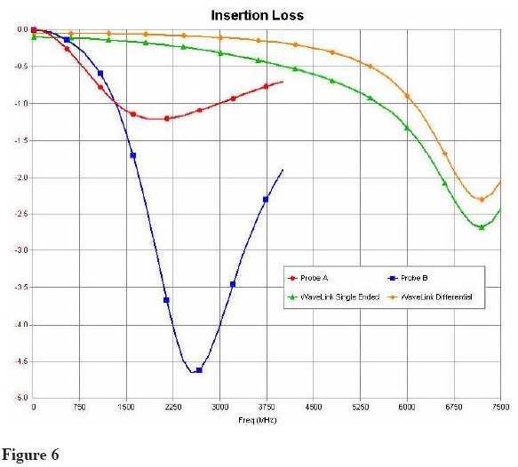 為了比較差分探頭的性能,通常在良好定義和常數電路中畫出負載效應。比如,每個探頭在50歐姆理想環境中產生的插損如Figure 6所示。插損用dB表示;作為電壓表示,必須除以20,采用反對數。比如Probe B導致的4.6dB的插損會產生41%的幅度損失。這對於被探測的信號有顯著影響。