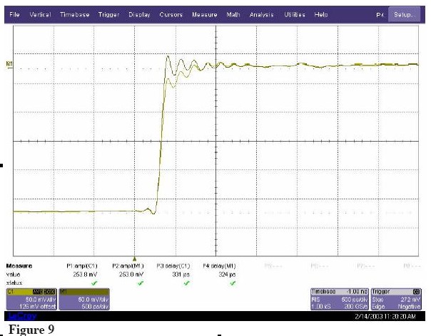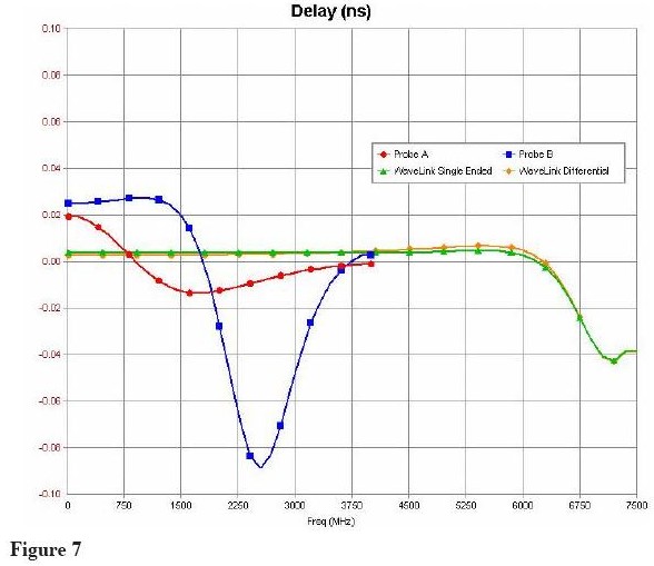 新的WaveLinks探頭不通過同一個測試信號,測量結果如Figure 10 所示。由於探頭負載(<1%)信號幅度有輕微的減少,但主要的信號邊沿完全沒有失真。探頭阻抗產生的延遲是2ps,不會隨著信號頻率改變。