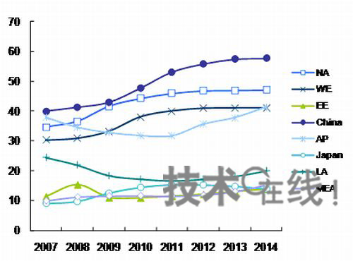 2010年中國的電視市場規模將達到4800萬台,按供貨量計算,規模為全球最大。其他新興市場國家的需求2010年也將開始恢複。到2014年,亞太地區的電視供貨量將超過西歐,新興市場國家將推動全球電視市場擴大。