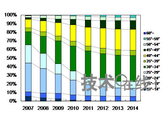 40英寸以上的電視在整體中所占的比例預計2010年會超過30%。2013年會達到40%,之後將基本飽和。分地區來看,中國正在追趕在電視大型化方麵領先的北美和西歐,從這一點來看,中國的影響力會擴大。