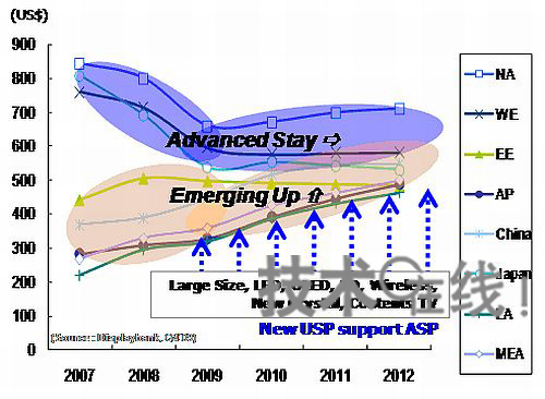 分地區看電視的平均銷售價格(ASP)變化可預測,發達國家市場的ASP暴跌將告一段落,而在新興市場國家,隨著FPD電視的增加和屏幕大型化,ASP將會繼續上漲。另外,估計LED背照燈液晶電視、3D電視、IPTV及無線功能等的普及也會成為推高ASP的因素。