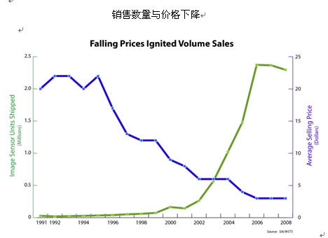 半導體在新應用中增加滲透最有趣的例子是隨著市場應用的銷售額增加,而芯片的價格卻不斷下降。如數碼相機,其中使用的半導體主要是非揮發存儲器,圖像傳感器 。在1990年代初期,固態圖像傳感器的售價為20-25美元,直到最近10年,圖像傳感器的總市場銷售額,仍是很小,幾乎可忽略不計。在2000年代圖像傳感器的價格己從20-25美元下降到5美元。在這價格範圍時,由於使用數量急速上升,使得在過去幾年中圖像傳感器的TAM達到半導體總銷售額的3%以上。在此同時,NAND閃存價格每年下降65%, 主要是市場需求數量成正比增加。其結果是數碼相機的銷售額及其使用的半導體持續的增長。