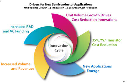 在新的應用和市場增長推動下,此種模式在半導體業中一次又一次的重複, 即應用數量的增長推動了半導體芯片價格的下降。應用市場的擴大又推動銷售額增大,進而為發展新技術提供資金, 進一步促進成本的下降, 又能增加新的應用市場誕生。如在數碼相機情況下, 低成本的固態圖像傳感器及存儲介質推動其銷售量的上升, 同樣能在數字攝像, 安全係統, 醫療中圖像處理, 汽車中及其它許多場合中得到大量的應用。因此, 半導體TAM的增長不僅是因為晶體管的價格每年下降35%, 而是由於許多新的應用市場的推廣共同促成。
