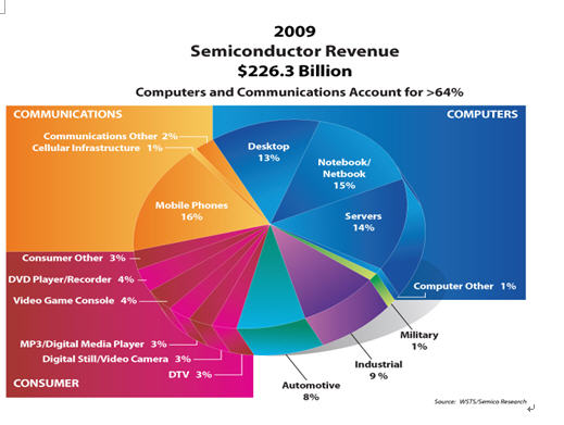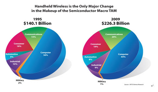 那麼未來將會是怎麼樣呢?隻(zhi)要(yao)晶(jing)體(ti)管(guan)的(de)數(shu)量(liang)按(an)目(mu)前(qian)的(de)高(gao)增(zeng)長(chang)倍(bei)率(lv)繼(ji)續(xu)走(zou)下(xia)去(qu),各(ge)種(zhong)新(xin)的(de)應(ying)用(yong)會(hui)層(ceng)出(chu)不(bu)窮(qiong),推(tui)動(dong)半(ban)導(dao)體(ti)市(shi)場(chang)總(zong)量(liang)進(jin)一(yi)步(bu)提(ti)高(gao)。因(yin)此(ci)全(quan)球(qiu)半(ban)導(dao)體(ti)市(shi)場(chang)在(zai)近(jin)15年來看似十分穩定,雖然如台式計算機市場已經飽和,但是筆記本電腦和上網本開始流行,加上消費類電子產品如遊戲機,平板電視,MP3, 數碼相機等, 由於半導體含量的增加推動了半導體TAM的增加。