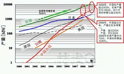 - 2000年以後,全球太陽能電池產量以年均40%左右的速度增長