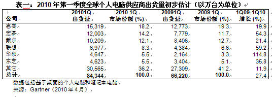 據Gartner發布的初步統計結果,2010年第一季度全球個人電腦出貨量已達到8,430萬台,與2009年同期相比增長27.4%,這一結果超過了Gartner此前所作的22%的增長預測。