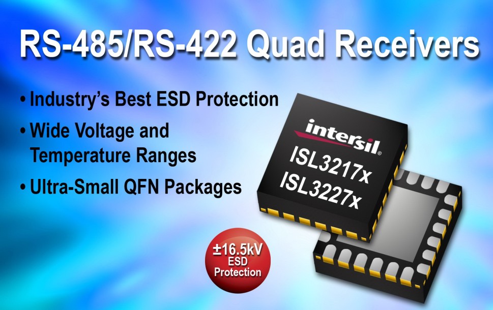 全球高性能模擬半導體設計和製造領導廠商Intersil公司今天宣布,推出新係列的小占位、四端口、可提供16.5kV ESD保護、具有寬電壓和寬溫範圍的RS-485和RS-422接收器 --- ISL3217x和ISL3227x係列。