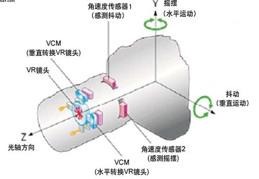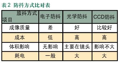 鏡頭防抖是通過鏡片的移動來補償相機的抖動,它由傳感器,微處理器,補償鏡片控製組,驅動控製部分組成,依靠補償鏡片的移動來校正手抖引起的光線偏移,如圖1,鏡頭不同,設計上有差異,但基本上都是透過補償鏡片組來補償。CCD防抖是通過感光元器件CCD(或CMOS)放在一個可移動支架上來,通過傳感器感知相機的抖動,由微處理器計算相應的移動量,由驅動部分對CCD移動,以達到防抖目的。目前,一般相機的防抖(CCD防抖或光學防抖)不是無限可以補償,一般為2~~3級,按表一來說,假設安全快門1/125,2級,快門速度1/30,快於此速度,容易拍清晰的照片,由此類推,3級,快門速度為1/15。表2為三種防抖方式的比對表。