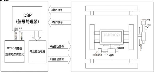 由圖2看出,在3D圖麵上,Z軸有自動聚焦功能,Z軸移動對成像基本沒有影響,有影響是在X軸(PITCH)與Y軸(YAW)。圖4為在晚上拍照,無防手抖與有CCD防手抖的結果。圖5為CCD防抖係統框架,CCD防抖是在鏡頭上增加CCD支架,利用步進馬達對X軸,Y軸的驅動,使CCD移動來補償CCD的抖動。MEMS陀螺儀選用要有X,Y軸Gyro芯片,內部含放大,低通,高通濾波,這樣可以大大減少相機的尺寸。Gyro信號連DSP的ADport,DSP的AD是10bit,滿足設計要求。資料運算用相機本身的DSP處理,可以減少一微處理器(Micro),降低成本。DSP對Gyro傳來的ω信息進行運算,計算補償量,通過馬達驅動電路驅動X,Y移動來達到補償的目的。X軸,Y軸的PI信號是Lens反饋DSP信息來校正CCD與Lens中心重合,避免補償過程超出Lens設計的補償範圍。