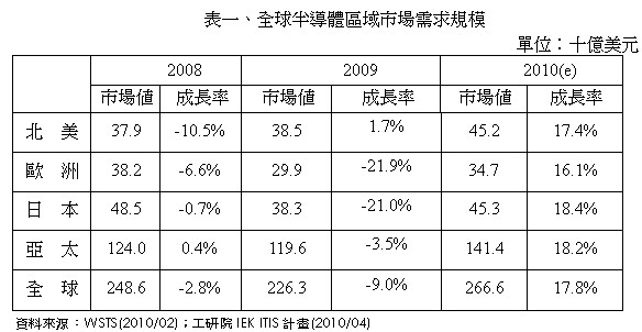 2009年全球半導體市場僅北美地區微幅成長1.7%,其他皆呈現負成長:亞太市場衰退3.5%,歐洲市場衰退21.9%,日本市場衰退21.0%。不景氣使得下遊電子產品品牌大廠,如Dell、HP、Sony等廠商增加產品委外代工之比例,以降低生產成本,增加其產品競爭力。因此,2009年(nian)主(zhu)要(yao)從(cong)事(shi)代(dai)工(gong)生(sheng)產(chan)之(zhi)亞(ya)太(tai)地(di)區(qu),才(cai)會(hui)出(chu)現(xian)僅(jin)小(xiao)幅(fu)衰(shuai)退(tui)之(zhi)情(qing)形(xing)。至(zhi)於(yu)北(bei)美(mei)地(di)區(qu)則(ze)是(shi)因(yin)為(wei)受(shou)到(dao)下(xia)遊(you)品(pin)牌(pai)廠(chang)商(shang)降(jiang)價(jia)促(cu)銷(xiao)成(cheng)功(gong),使(shi)得(de)市(shi)場(chang)呈(cheng)現(xian)小(xiao)幅(fu)成(cheng)長(chang)。