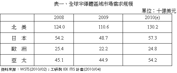 2009年各地區產值皆較2008年衰退。其中,以歐洲地區衰退幅度最大。其最大原因在於Qimonda退出記憶體產業所致。預計2010年在全球景氣複蘇下,半導體景氣也將在2010年呈現正成長力道。 2010年亞太地區受惠於中國大陸等新興市場內需持續強勁、政府刺激內需政策之支持、IDM大廠為降低成本持續釋單至亞太地區,以及記憶體產業景氣大幅回升下,預期產值成長幅度將較其他地區來得高。2010年各地區產值年成長率預估值為:北美地區17.7%,日本地區17.7%,歐洲地區11.7%,亞太地區20.7%。