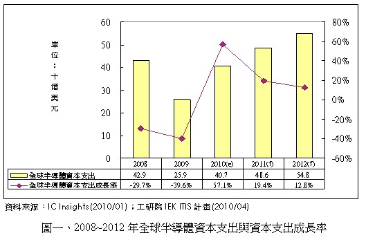 金融風暴使得全球廠商皆大幅減少資本支出金額,以保存手中之現金,度過此波不景氣。 2009年全球半導體資本支出為259億美元,較2008年429億衰退39.6%。然而,在看好今年歐美主要消費市場需求之複蘇,以及新興市場需求力道可望持續下,2010年全球半導體廠商將提高資本支出達407億美元規模,較2009年大幅成長57.1%。其中,全球記憶體廠商大幅提高資本支出,以提升其先進製程水準,是主要動力之一。