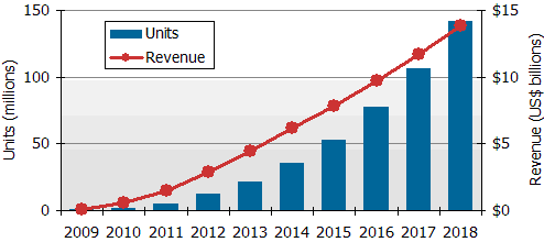 - 預估到2018年將大幅成長到1億4千200萬台,年產值達139億美元