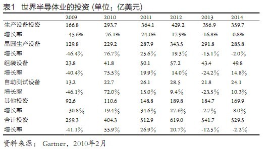 近期半導體業的迅猛增長,推動了半導體生產設備市場的快速複蘇,存儲器、代工業的發展以及進一步走向微細化先進技術的要求,則是主要的拉動力量。在各項生產設備中晶圓生產線(wafer fab)設備最為重要,增長也最快,2010年將竄升76.7%,達229億美元,獨占半導體生產設備的78%,整個半導體業投資的近57%。組裝設備增長75.5%,達41.8億美元,自動測試設備增長72%,達22.7億美元。其他有關投資增長19.4%,達110.6億美元,整個半導體業投資共增長55.9%,達到404.3億美元(表l)。