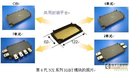 三菱電機最新開發的第6代IGBT模塊,采用優化載流子存儲層的摻雜分布和精細圖形工藝的溝槽型IGBT矽片,進一步降低模塊的開關和通態損耗。第6代IGBT模塊內的續流二極管矽片,由於采用薄膜晶片工藝和擴散技術,這種矽片優化了緩衝層雜質分布和本征層、緩衝層厚度,減小了反向恢複的拖尾電流,並且獲得更好的VF和Qrr的折衷關係。實驗表明新型矽片具有足夠寬SCSOA和最少10μs的短路承受時間。第6代IGBT模塊的NX係列模塊采用第6代矽片,最大允許結溫可高達175C。 采用第6代NX係列IGBT模塊的變頻器功率損耗比傳統產品的降低約20%。例如:1200V/150A IGBT模塊應用於30kW的變頻器,功耗可從200W減少到160W(CM150TX-24S與CM150DX-24A對比)。