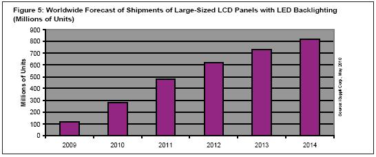 圖5所示為2009-2014年全球用於大尺寸液晶麵板的LED背光出貨量預測。