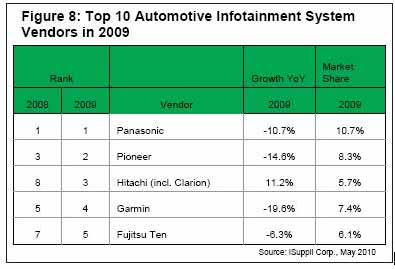 另一家日本一線供應商日立2009年排名第三。該公司2008年排名第八,是2009年10大廠商中營業收入增長的兩家廠商之一。日立2007年與Clarion Co. Ltd.合並,合並營業收入2009年占全球信息娛樂市場的5.7%。