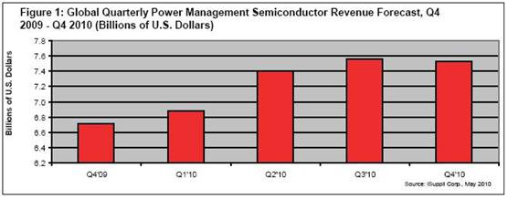 2010年第一季度,電源管理半導體銷售收入達到69億美元,比2009年第四季度的67億美元增長2.9%。該市場在2009年第三季度曾陷入停滯,第四季度開始擴張,第一季度數據顯示該市場仍在擴張。