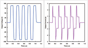 圖2±100V電源時典型的超聲波發送器輸出,以及流入100Ω和300pF並行負載的相應瞬時電流