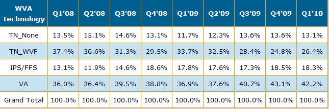 根據最新發布的 DisplaySearch Quarterly Wide Viewing Angle Technology Report, (DisplaySearch季度廣視角技術出貨報告) , VA(Vertical Alignment)型廣視角技術的麵板出貨在所有LCD視角技術的出貨中取得領先,以出貨麵積計算, VA型出貨占了2010年第一季全球所有麵板出貨的43.5%(如以下附表所示)。而在各種不同的視角技術當中,VA(Vertical Alignment)型廣視角技術的麵板出貨從2008年第一季的36%持續成長到2010年第一季的43.5%,目前在麵板廠的布局上,LG Display, IPS Alpha 與BOE采取了 IPS (In Plane Switching)與FFS(Fringe-field switching)的技術,其餘LCD TV麵板生產廠商在32寸及以上的LCD TV麵板采用了VA(Vertical Alignment)型廣視角技術。