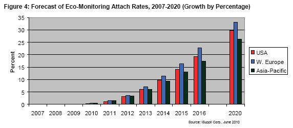上述每類應用的汽車配售率預計都會增長,2010-2013年增長比較緩慢,隨後從2014年開始基本以兩位數的速度增長,直到2020年末。iSuppli公(gong)司(si)的(de)圖(tu)表(biao)顯(xian)示(shi),節(jie)能(neng)監(jian)測(ce)和(he)節(jie)能(neng)建(jian)議(yi)近(jin)期(qi)將(jiang)大(da)幅(fu)增(zeng)長(chang),而(er)由(you)於(yu)複(fu)雜(za)性(xing)和(he)需(xu)要(yao)與(yu)其(qi)它(ta)汽(qi)車(che)係(xi)統(tong)整(zheng)合(he),節(jie)能(neng)動(dong)力(li)總(zong)成(cheng)的(de)布(bu)署(shu)比(bi)較(jiao)緩(huan)慢(man)。但(dan)到(dao)2020年,美國和西歐的節能動力總成應用將達到35%的配售率,接近節能監測和節能建議係統的水平。