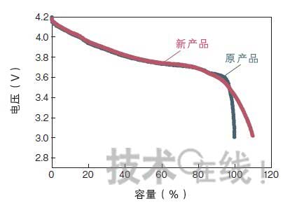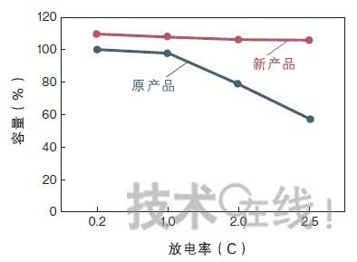 圖2:高gao輸shu出chu功gong率lv下xia的de放fang電dian特te性xing優you異yi新xin產chan品pin與yu原yuan產chan品pin相xiang比bi,在zai放fang電dian率lv較jiao高gao時shi也ye能neng維wei持chi高gao容rong量liang,具ju有you優you異yi的de高gao輸shu出chu特te性xing。圖tu由you本ben站zhan根gen據ju日ri立li麥mai克ke賽sai爾er的de資zi料liao製zhi作zuo。