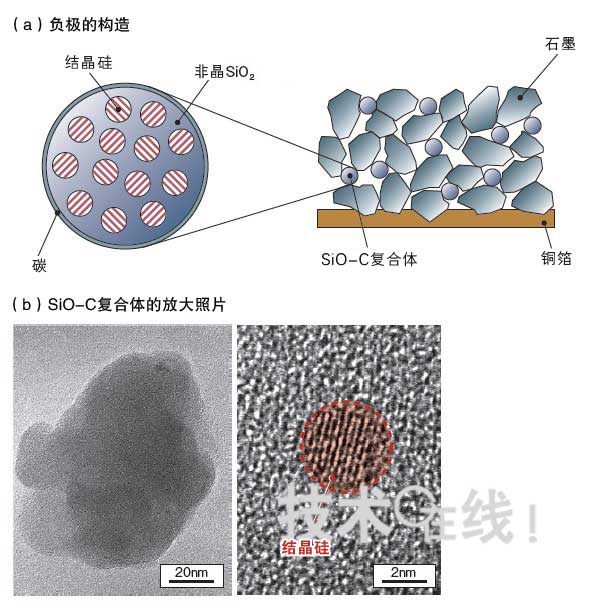 負極采用日立麥克賽爾量產的矽類材料的單元混合了SiO-C複合體和石墨(a)。SiO-C將nm級的矽分散到非晶SiO2的構造體內(b)。圖由本站根據日立麥克賽爾的資料製作。
