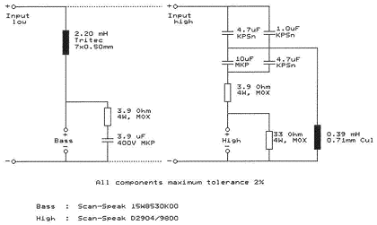 如果允許低音範圍的聲壓級低於100dB,則可使用一隻口徑較小的低音單元。在這樣低的聲壓級下通常難以使低頻響應下潛到50Hz以下,但本音箱使用的Scan-Speakl5cm低/中音單元在低頻下卻能產生足夠的聲輸出並能令人滿意地重放2kHz-3kHz的聲音,這樣就不必使用中音單元了。某些口徑較小的低音單元設計成能在較小的音箱中令人非常滿意的重放低音,本音箱使用的低/中音單元就是一個很好的例證。