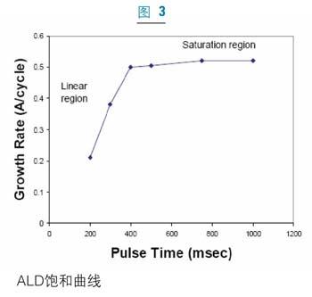 圖3中的飽和曲線說明了ALDguochengdeziyueshutexing。shengchanglvsuimaichongshijianchengxianxingzengchang,zhidaodadaobaohetiaojian。dadaobaoheyihou,zengchanglvweichangshu,qiebuzaisuimaichongshijianbianhuaerbianhua。danshi,ruguotongshicunzaiyizhongjishengdeCVD生長成分或反應物的分解的話,增長率就會顯著增加。因而,飽和曲線通常用來確定ALD的純度。ALD生長速率介於每循環0.3埃到1.5埃間。雖然ALD的生長速率在製備很薄的膜(<200埃)時還可以接受,但在用ALD生長厚膜時,生長周期就成為挑戰。
