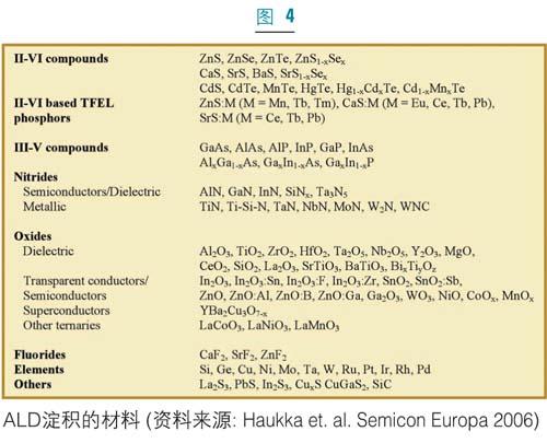 因為ALD在半導體製造的不同領域都經過評估和采用,所以選擇合適的原始反應物(precursor)就變得日益重要。ALD原始反應物應當具備幾個“理想”的品質,即要具有一定的揮發性和可重複的汽化率;理想情況下不應在反應溫度下發生自身反應或分解;應當極易與補充反應物發生反應;應能產生可揮發的副產品;基於生長速率和成核的原因應具有最佳的配合基尺寸。為了使用方便,原始反應物最好為液體有機金屬物,但是薄膜的性質和應用指標(如雜質含量、電學特性等)應該決定材料的選擇。另外,對製備成本的關注也要求反應源能與傳統的製備工藝在成本上更有競爭性。ALD具有很高的反應源的使用效率,這通常能平衡新反應源的高價格。隨著ALD進(jin)入(ru)大(da)規(gui)模(mo)生(sheng)產(chan),並(bing)且(qie)工(gong)業(ye)界(jie)減(jian)少(shao)對(dui)反(fan)應(ying)源(yuan)的(de)選(xuan)擇(ze),對(dui)成(cheng)本(ben)的(de)顧(gu)慮(lv)將(jiang)可(ke)能(neng)會(hui)隨(sui)著(zhe)化(hua)學(xue)品(pin)供(gong)應(ying)商(shang)規(gui)模(mo)化(hua)其(qi)生(sheng)長(chang)流(liu)程(cheng)而(er)減(jian)輕(qing)。利(li)用(yong)現(xian)有(you)的(de)反(fan)應(ying)源(yuan),目(mu)前(qian)人(ren)們(men)已(yi)經(jing)可(ke)以(yi)製(zhi)備(bei)多(duo)種(zhong)多(duo)樣(yang)的(de)ALD薄膜(圖4)。