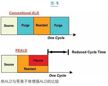雖然ALD最zui初chu僅jin被bei視shi為wei一yi個ge純chun粹cui的de熱re工gong藝yi,但dan是shi對dui基ji本ben的de原yuan子zi層ceng澱dian積ji循xun環huan的de微wei小xiao變bian更geng已yi經jing提ti出chu了le多duo年nian。最zui常chang見jian的de變bian種zhong是shi等deng離li子zi體ti增zeng強qiang原yuan子zi層ceng沉chen積ji工gong藝yi(PEALD)。PEALD可取消原子層澱積中的一個步驟,從而進一步縮短生產周期。PEALD過guo程cheng中zhong,在zai澱dian積ji溫wen度du下xia互hu不bu發fa生sheng反fan應ying的de互hu補bu反fan應ying源yuan在zai同tong一yi時shi間jian被bei引yin入ru到dao反fan應ying室shi,然ran後hou反fan應ying源yuan關guan閉bi並bing淨jing化hua反fan應ying室shi,接jie著zhe施shi加jia一yi個ge直zhi接jie的de等deng離li子zi脈mai衝chong,這zhe個ge等deng離li子zi體ti環huan境jing產chan生sheng高gao活huo性xing自zi由you基ji並bing與yu吸xi附fu於yu襯chen底di的de反fan應ying物wu反fan應ying。關guan閉bi等deng離li子zi可ke迅xun速su清qing除chu活huo性xing自zi由you基ji源yuan,反fan應ying室shi中zhong一yi直zhi流liu過guo的de清qing潔jie氣qi體ti將jiang清qing除chu過guo剩sheng自zi由you基ji和he反fan應ying副fu產chan物wu(圖5)。除了較高的生長速度和較短的周期時間,PEALD薄膜表現出比傳統的原子層澱積薄膜更高的密度和更高的擊穿電壓。該技術已經在多個應用中取得了發展,如DRAM、MIM和eDRAM電介質薄膜。不過在一些關鍵的薄膜應用中,如高功率柵介質,等離子損傷以及界麵氧化的顧慮阻礙了PEALD技術的廣泛應用。