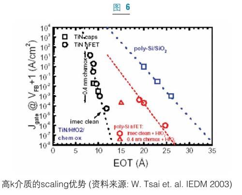 當高k材cai料liao替ti代dai二er氧yang化hua矽gui材cai料liao後hou,金jin屬shu柵zha必bi須xu取qu代dai傳chuan統tong的de多duo晶jing矽gui柵zha以yi充chong分fen實shi現xian電dian學xue優you勢shi。由you於yu費fei米mi能neng級ji釘ding紮zha效xiao應ying,多duo晶jing矽gui耗hao盡jin和he化hua學xue不bu穩wen定ding性xing,多duo晶jing矽gui柵zha電dian極ji已yi被bei發fa現xian與yu高gaok柵介質不兼容。圖6顯示了二氧化矽(SiO2)和二氧化鉿(HfO2)柵介質的柵級漏電流比較。在相同的等效氧化層厚度(EOT)下,HfO2/TiN柵堆的柵漏電流要比傳統的SiO2/Poly-Si柵堆的柵漏電流小好幾個數量級。