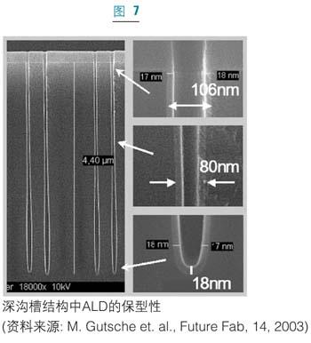 最近,Al2O3/HfO2以及Al2O3/ZrO2結構也引起了人們的關注。PEALD也已經用於eDRAM中。電容滿足所有的要求,即等效氧化層厚度要小於8埃,125攝氏度時漏電流要小於1fA/cell,工作電壓為1伏時壽命要大於十年。圖7為典型的ALD薄膜在深槽結構的保角性和動態存儲器生產中的半球形矽晶結構,金屬ALD薄膜,例如氮化鈦(TiN)也廣泛應用於動態存儲器製造中的電容電極。