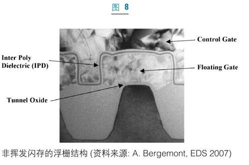 在非揮發性存儲器的應用中,人們也開始研究ALD在介質和金屬澱積中的應用。閃存技術主要由浮柵(floatinggate)技術主導(圖8)。高k電介質目前正被研究作為二氧化矽(SiO2)和氮化矽(Si3N4)柵介質的替代品,以改善浮柵和控製柵之間的電容耦合率。到2010年,浮柵技術可望被一些技術所取代,例如電荷捕獲存儲器(TANOS,NROM),相變存儲器(PCM)、鐵電記憶體(存儲器),三維堆疊式存儲器也正在研究中。ALD已被用作這些技術的阻擋層和擴散阻擋層。