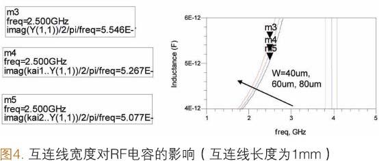 除互連線長度之外,互連線的寬度也會對RF電容產生影響。在襯底的製作過程中,線寬通常會發生變化(舉例來說,與設計寬度相比,實際線寬的變化範圍為±10.0μm~±15.0μm)。如圖4所示,如果設計的互連線為1.0mm長,60.0μm寬,實際卻達到40.0μm寬,在2.5GHz下等效電容變化將達到5.3%(以3.0pF接地SMD電容為例)。如果把這種SMD電容用於濾波器中,對於RF應用來說,電容值5.3%的變化將導致約2.7%的頻移。我們必須對RF應用中含有SMD電容的RFSiP模塊的襯底製造容差進行細致研究。