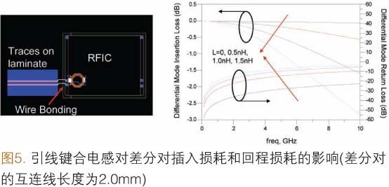 圖5顯示了鍵合引線電感是如何影響差分對連線的插入損耗的。在實例中,100.0Ω差分對的長度為2.0mm。假設差分對的一端使用引線鍵合方式與RFIC連接,並把直接與引線長度相關的電感(L)設為可變值。正像回程損耗曲線圖表示的那樣,加上引線鍵合電感可使差分對偏離100.0Ω這一匹配條件,結果使插入損耗增大。在5.0GHz下,0.5nH、1.0nH和1.5nH引線電感的插入損耗分別為0.2dB、0.5dB和1.2dB。即使達到極高的頻率,疊層上的差分對本身仍具有良好的阻抗匹配特性。