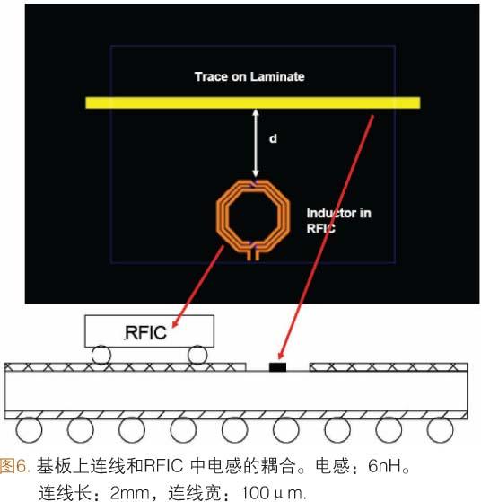 為了對主時鍾線和RF元件之間的相互作用進行分析,把壓控振蕩器(VCO)中使用的RF電感(6.0nH)放置在穿通多層襯底的時鍾互連線附近(圖6)。我們在這個研究中使用的互連線長為2.0mm。當VCO電感和互連線之間的橫向距離(d)大於0.5mm時,產生的耦合信號將小於-80.0dB。耦合信號的實際要求由SiP係統級電設計決定。