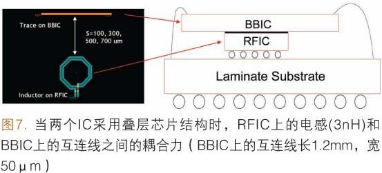 圖7給出了BBIC和RFIC采用SiP(為簡單起見,實例中未表示SMD元件)疊層芯片結構的實例。在這個實例中未使用金屬屏蔽層,使用環氧芯片粘接材料把BBIC直接堆疊在RFIC上。就像前文提到的那樣,BBIC中的主時鍾信號(20.0MHz或40.0MHz)包含一些高頻成分,落在RF芯片通帶的範圍內。如果BBIC中時鍾互連線和RF芯片之間沒有保持足夠的隔離,特別是在VCO電感中,主時鍾信號可能使RF電路產生噪聲,降低RF芯片的選擇性。