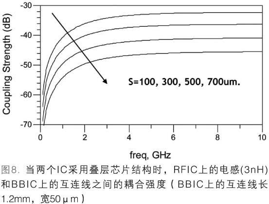 圖8表示了BBIC和RFIC電感之間的耦合強度(未使用隔離層)。假設BBIC和RFIC的厚度為250.0μm時,對VCO電路中的3nH電感進行了研究。BBIC中主時鍾的互連線設置為1.2mm長。根據模擬結果,當橫向距離(S)為100.0μm時,2.5GHz下的隔離為-35dB。這一隔離值對大多數RF應用來說是不夠的。當橫向距離為700.0μm時,隔離值提高為-50dB,這個值對大多數RF應用來說仍然不夠。為保證VCO電感的性能,位於BBIC電感上方的主時鍾不能使用長互連線。根據以上分析,我們還應對RFSiP使用的疊層芯片法做進一步研究,從而判斷BBIC和RFIC器件之間出現嚴重相互幹擾的可能性。